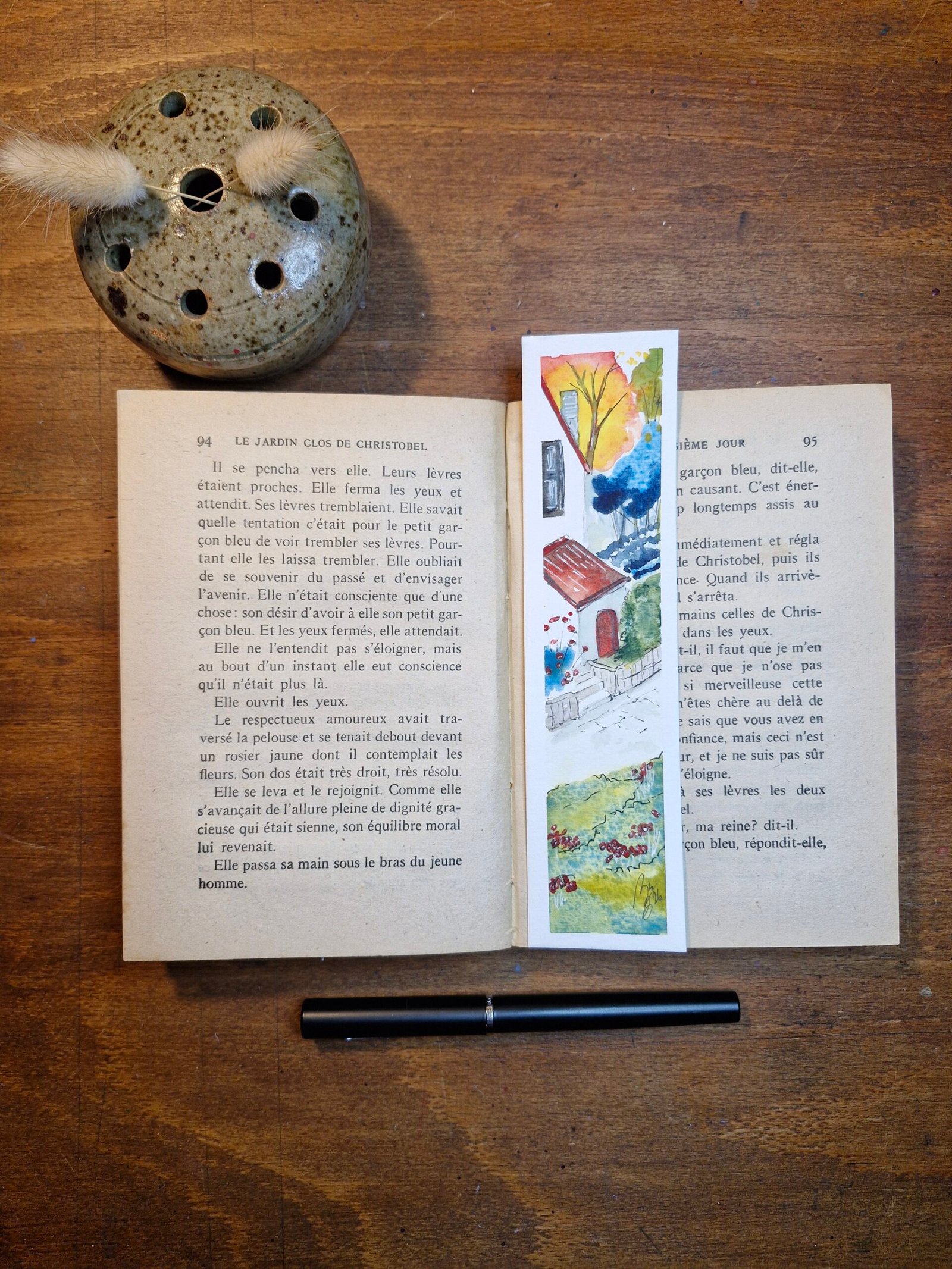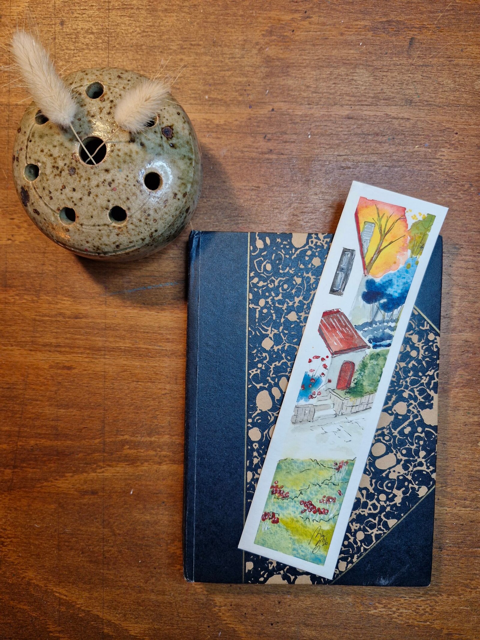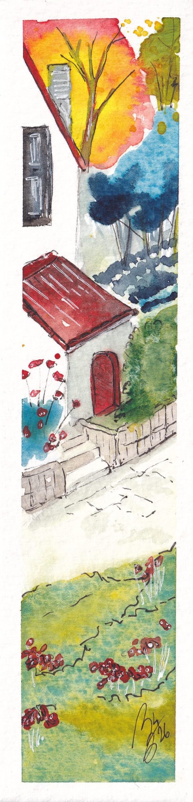 Un marque-page original à l’aquarelle capturant la chaleur des derniers rayons de soleil sur ses tuiles rouge vif.